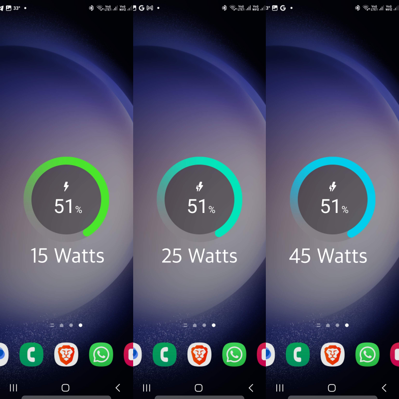 Samsung saat ini mengimplementasikan tiga tingkatan kecepatan pengisian daya yang berbeda pada jajaran ponsel Galaxy mereka: 15W (watt), 25W, dan 45W. Setiap kombinasi warna lingkaran dan jumlah petir secara intuitif menunjukkan kecepatan pengisian daya mana yang sedang aktif. Jadi, kamu bisa langsung tahu apakah ponselmu sedang diisi daya dengan cepat atau standar.