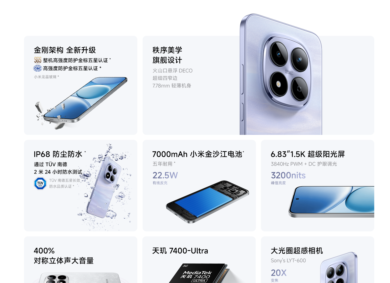 - Note 15 Pro+: Ponsel pertama dengan Snapdragon 7s Gen 4, memberikan peningkatan CPU dan GPU sebesar 7% dari generasi sebelumnya. Dilengkapi pendingin vapor chamber 5.200 mm². Ada juga varian Satellite Messaging Edition, pertama kalinya hadir di Redmi.